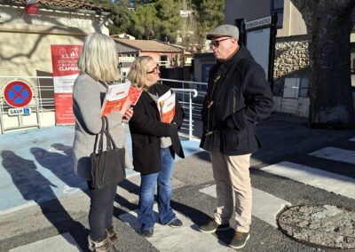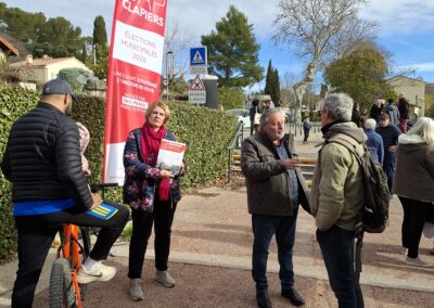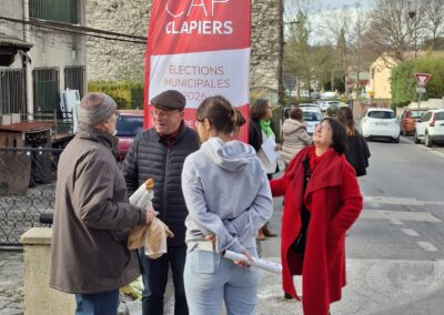 Chaque samedi, les membres de l’équipe « Continuons d’Agir pour Clapiers » se rendent dans un quartier différent pour venir à la rencontre de ses habitants et échanger. Quelques jours avant, les quartiers sont annoncés sur les réseaux sociaux et des invitations distribuées dans les boites aux lettres.